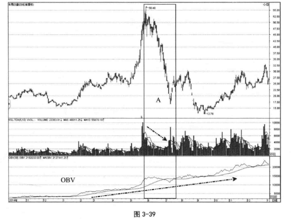 应用这些原则时,绝不可照搬或死钻牛角尖。如图3-39所示,OBV在图中整体呈上升趋向,A区域之前,基本能够体现第二个原则的情况,但A区域却出现意外:股价的大幅暴跌在OBV上仅仅反映为一个微幅波动。