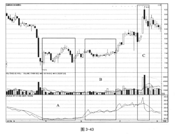 ( 3 )VR处于从低价区域上升到安全区域时,成交量可能会进入衰退期,股价很容易转入下降期。如果VR在安全区域附近盘整(或直接穿越),一旦进入获利区域,市场极易产生一段多头行情,如图3-43中B区域所示。