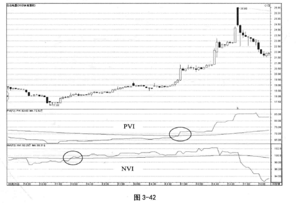 如图 3-42所示,NVI与PVI分别向上穿越移动平均线,显示行情由缓慢上涨到强势上涨启动的过程。