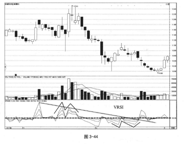( 4 ) VRSI向上突破其高点连线时买进,向下跌破其低点连线时卖出,如图3-44所示。