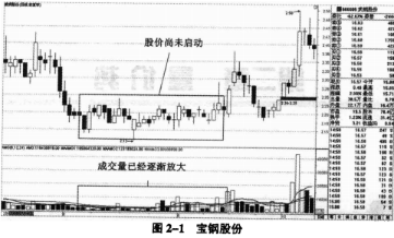 2006年8、9月,宝钢股份在股价尚未启动的时候,已经在积极地放量了。而后,宝钢股份拉开了强劲的上升行情(见图 2-1)。