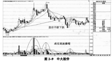 中大股份成交逐波萎缩,则股价不断下沉。在实战中,投资者应该准确把握波段中四个阶段的量价特点,以找到准确的切人点和出局点,最大化地获取收益和规避风险。量比价先行是技术分析的核心理念之一,也是波段投资者最需要掌握的投资利器。