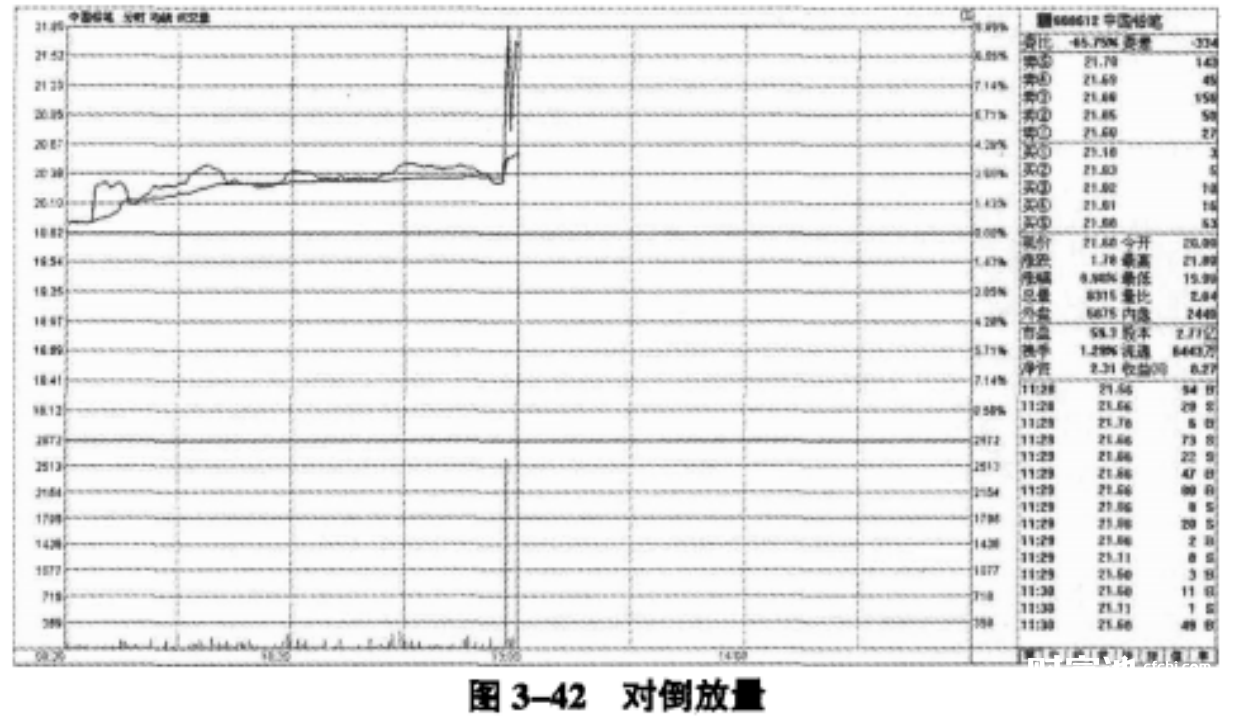 (2)对倒型见图3-42:诱多和诱空。全天换手率高,而盘中成交清淡,甚至有的时间段交易空白,成交集中于几笔大单,则多为诱多。
