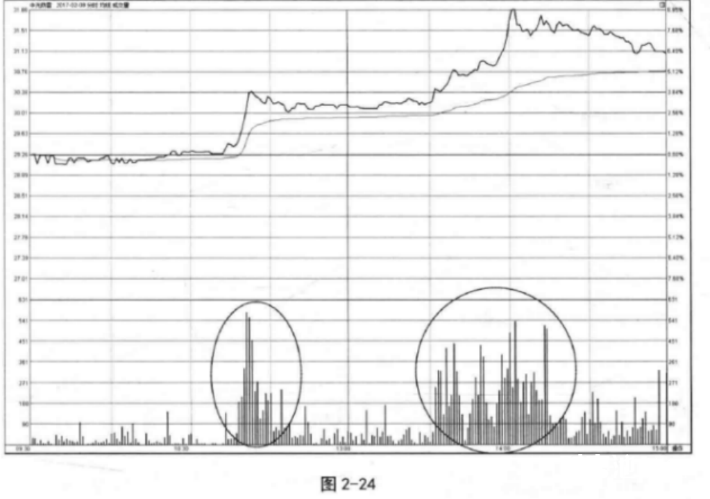 如图2-24所示,当日的分时走势显示,该股出现两波较为密集的成交。这两波密集成交对股价上涨起到了明显的推动作用。可以说,该股当日的升幅主要归功于密集成交。
