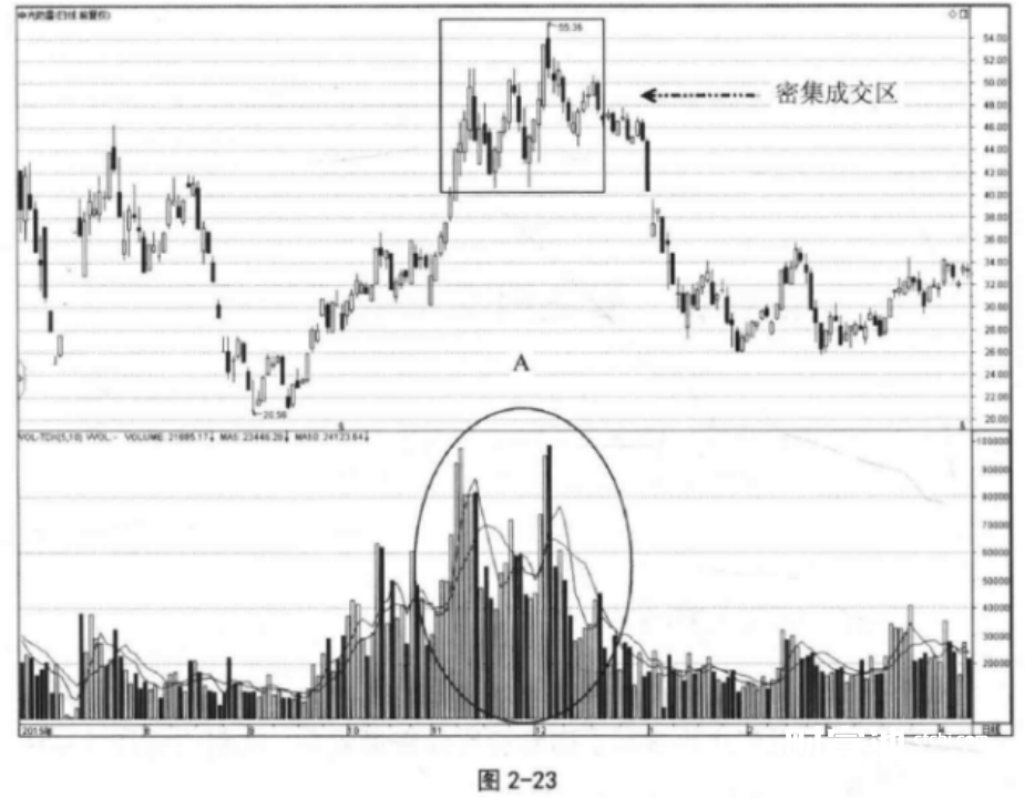如图2-23所示,A区域由聚量、变量等形态构成的成交量汇聚集中的情况,即为密集成交。K线图中与密集成交相对应的,股价处于箱体运行的区域则为密集成交区。