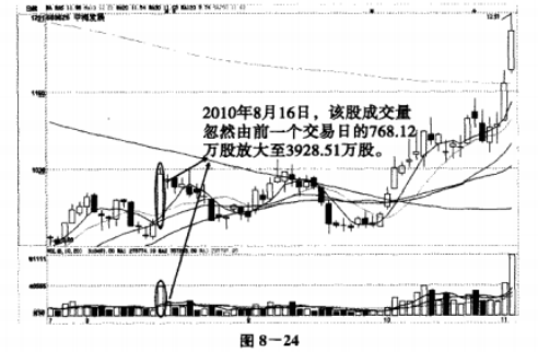 如:中海发展(600026) 在2010年8月16日,成交量忽然由前一天的768. 12万股增至3928. 51万股。此后成交量每天都逐级放大,股价开始上升,此时投资者就应积极建仓,见图8- 24: