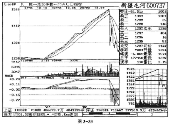 (图3-33) 600737新疆屯河庄家拉高和出货,在1998年3月2日前11天(2月27日)将股价对倒推高,每五分钟K线图呈小方块沿着45度的斜率缓慢上升,收在13.81元,第二天继续按照45度的斜率对倒推高,三小时交易后已到达15.04元,完成主力的目标位。