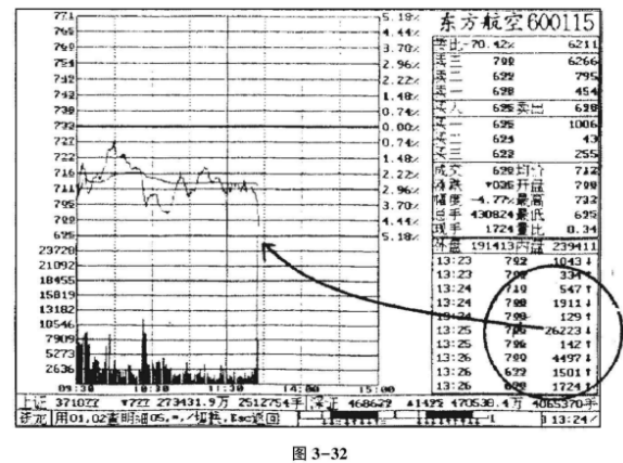 (图3-32) 600115东方航空上市第二天1997年11月6日跳空低开在7. 08元,而后反弹到7.32元继续高位震荡,下午1点24分,主力终于耐不住震荡走势,开始巨额卖出。13点25分,一笔26223手的卖出单将股价从7.08元炸到7.06元,而后紧跟着出现了四位数的巨大抛盘,13点26分,股价已到达6.98元。此时股价正在通过高位震荡向加速暴跌的临界点,在这里压低价格卖出都属于明智的。