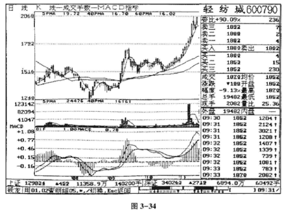 (图3-34)600790轻纺城庄家为了延长派发时间,提高临界点的价位,更是连续半个月的推高。1998 年10月下旬,股价从16. 50元附近向上突破,而后用巨量推高,11月16 日创20. 58元的高价,将临界点整整提高了4元,第二天开盘跌停, 74万股卖出盘压在卖一,用跌停板通过临界点使前四天的跟风盘一网套牢。