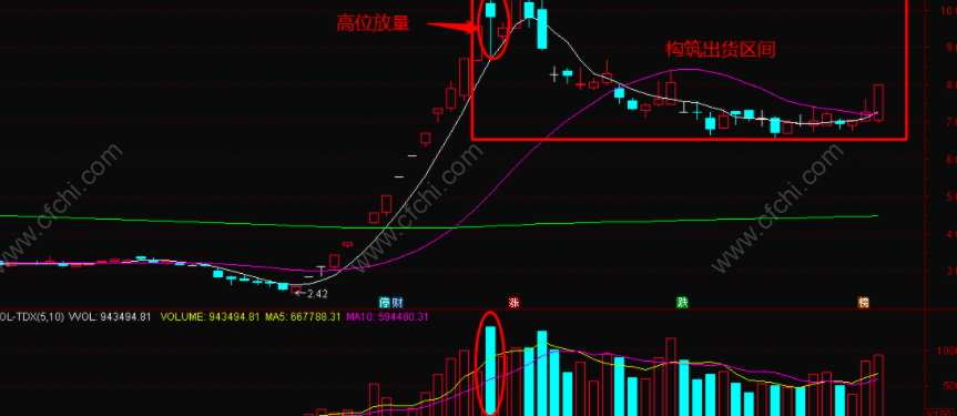 我们要警惕的是真正的顶部的高位放量,如果在顶部出现十字星、上下影线、盘整阴跌等形态,这时就要注意了。