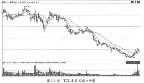 如图2-2-15,2008年7月,TCL集团(000100) 股价底部震荡对前期高点突破的时候,成交量连续温和放大,而后股价随指数调整时,量能明显萎缩,这种量能形态使得场中的资金没有机会完全顺利脱身。