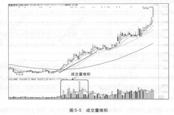(2)观察成交量堆积。它对于判断主力的建仓成本有着重要作用。除了刚上市的新股外,大部分股票都有一个密集成交区域,股价要突破该区域需要消耗大量的能量,而它也就成为主力重要的建仓区域,往往可以在此处以相对较低的成本收集到大量筹码。