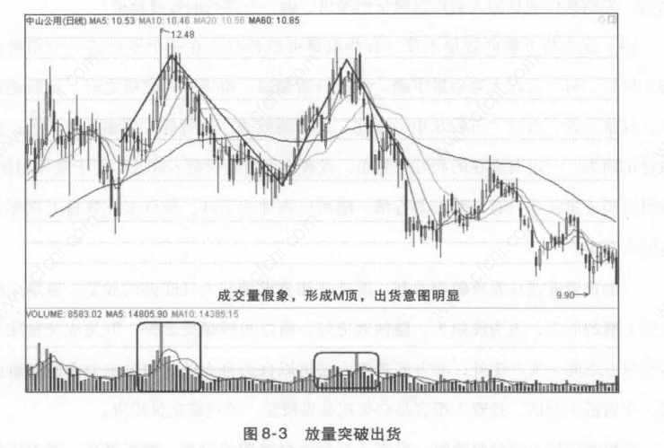 成交量急剧上升,推动股价上涨。投资者会立即发现它的成交量异常变化,不少人甚至会试探性地买入,这就为主力出货提供了机会。主力就是这样利用量增价升这一普遍被人认可的原则,制造了假象,达到出货的目的(图8-3)。