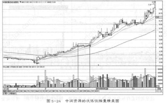 如图5-24所示的中润资源。股价在经历了长期的下跌后,股价止跌并开始反弹,在反弹过程中,成交量明显放大,意味着主力开始参与此股。在主力的大力度建仓作用下,出现了明显的上涨。但随后股价出现了横盘震荡的走势,并且随着震荡的延续,成交量相比前期的反弹而言明显缩小。