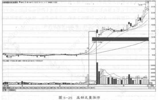 如图5-25所示的合肥城建,就是在国企改革的利好下连续成交量缩量一字涨停,在涨停板打开后,后市仍不断创出新高。