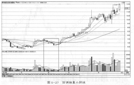 股价自底部向上运行,或者处在上升趋势中,但绝对价位不高。最近以小阴小阳线的形式回调,成交量极度萎缩。小K线回调本身说明下跌动能不足,投资者应该可密切关注此类股票,一旦重新拉出阳线,收复失地,可积极介入。