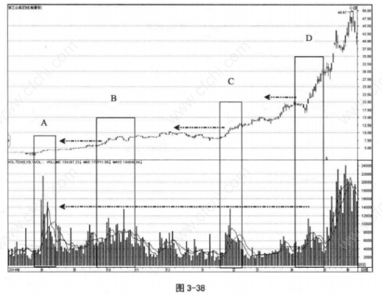 如图3-38所示,A区域放出较大的量之后,随后B、C、D区域的量能整体逐步降低,股价却保持稳定的趋势性上升。减量过顶的多次出现给与交易者的重要提示就是,该股可能已经被主力控盘。