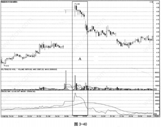 如图3-40所示,A区域OBV的急速上升与急速下跌,能够较好地反映出股价走势。图3-40为30分钟K线图OBV在股价短期波动上的反应与提示信号,具有重要的参考价值。