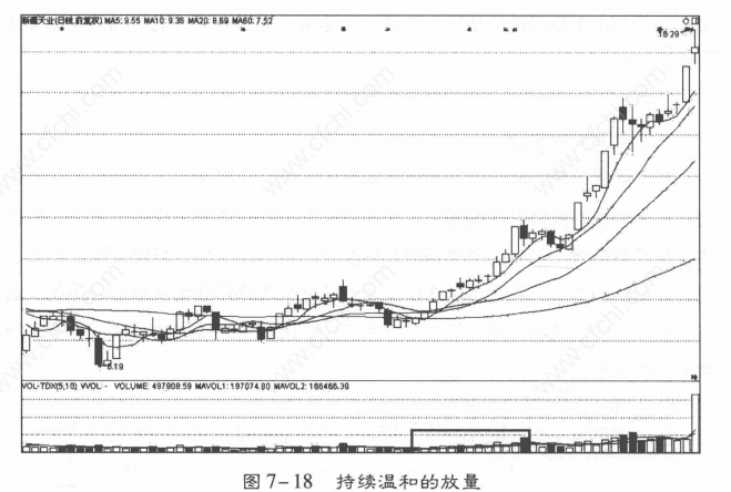 所谓节奏鲜明的放量,是指在股票的上升趋势中,股价始终保持量增价涨、量缩价跌的理想状态,并且呈现出持续长久的放量现象(图7-19)。