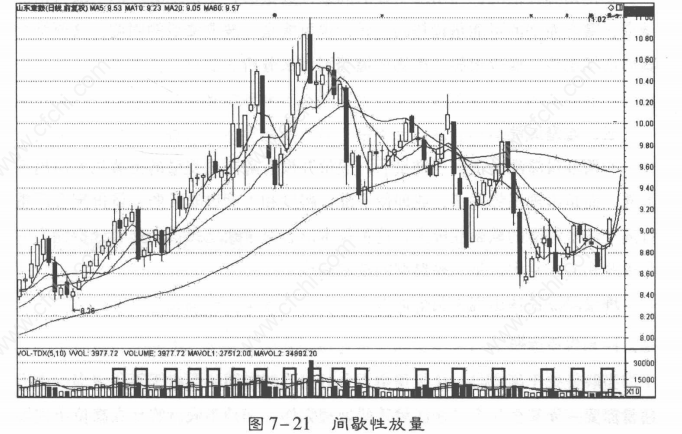 间歇性放量又可以称为成交量单日暴增,这种单日异动情况无法反映出市场的连续状态,多是主力操纵的结果或上市公司重大利好的突然发布以及重大、意外事件的影响,其成交量可达到正常水平的4倍以上(图7-21)。