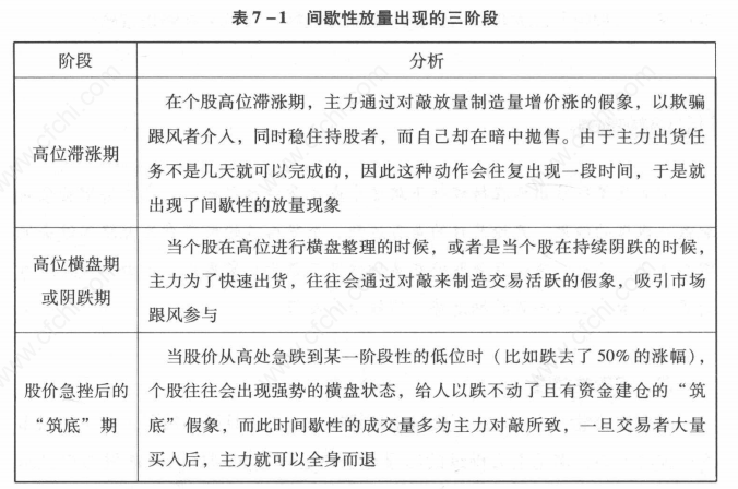 间歇性放量通常是主力对敲出货的结果,它往往出现在三个阶段,详见表7一1。