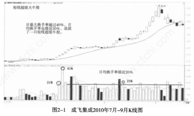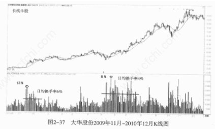 一般而言,短线极具爆发力的牛股(甚至表现为持续涨停)所对应的成交量是最大的。此时,单日换手率往往可以达到20%以上,甚至出现30%-40%,日均成交量也会接近20个百分点。而对于大波段牛股来说,换手会小一些,但是单日换手也能够达到10个百分点以上,甚至是20个百分点。