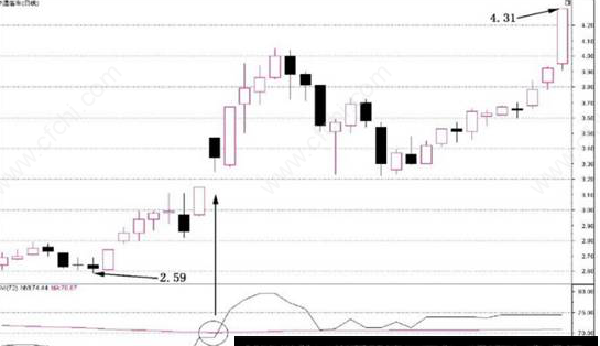 NVI指标由下往上穿越其N天移动平均线,代表长期买进讯号。