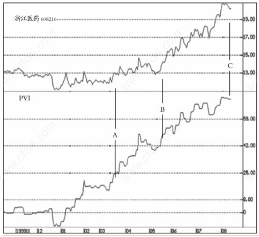 因此,这种价涨量增的市场,也会成为散户主导的市场。然而,PVI并不是一个"反市场操作"指标,也就是说,以散户群体为主导的股市行情,并不表明股价绝对会下跌。在一般的市场里,散户群体的步调不一致容易导致股市行情的上下波动。