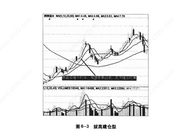 如图6-2所示,主力在底部吸筹的特征是成交量较之前放大,分时走势图频繁出现尖角波,显示主力在积极吸筹,但总体成交量不大,目的为了做盘隐蔽在底部尽量减少跟风盘。