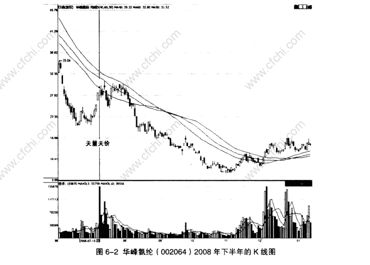 图6-2是华峰氨纶(002064)在2008年下半年的K线图。主力利用反弹出货,走出了7月10日天量天价的图形。
