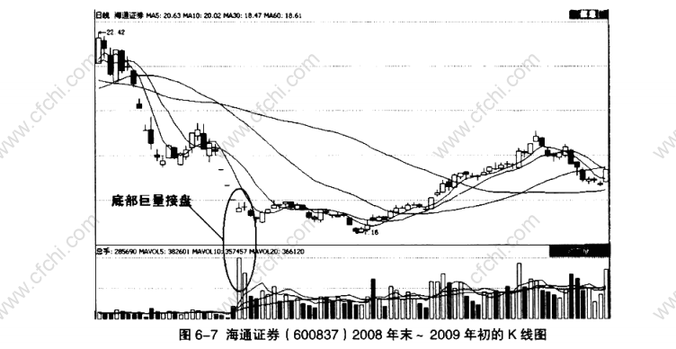 图6-7是海通证券(600837 )在2008年末~2009年初的K线图。2008年11月26日原本被限制流通的股票开始上市,于是在主力机构开始承接时,底部放出巨量,当日换手率达到27%、成交金额超过37亿元。
