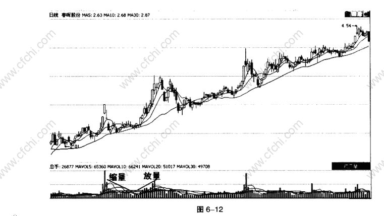 股价经过长期下跌后,如果放量,表明有实力机构介入;放量后的缩量,表明主力在洗盘:再次放量时,表明洗盘已结束.拉升在即,此时正是介人的好时机。如图6-12所示。