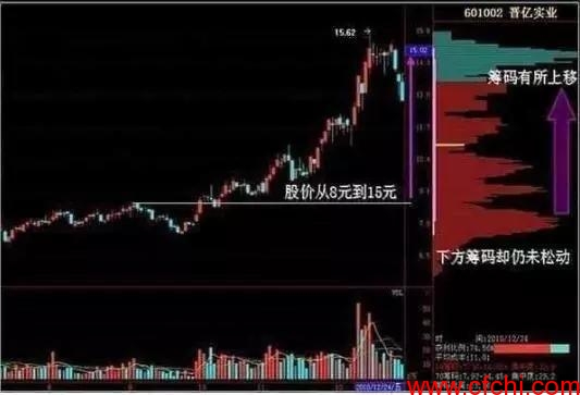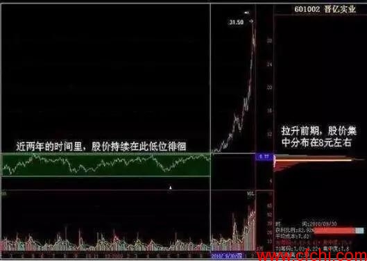 晋亿实业(601002),在近两年的时间,股价持续在低位徘徊,主力在此期间进行了长时间的吸筹,在拉升前期,股价集中分布在8元左右,这个就是主力的大概成本。