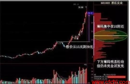 如下图,晋亿实业(601002)该股股价从15元拉升到29元,筹码集中在18元附近,主力派发手中筹码后,下方的筹码出现明显的松动,但仍未完全派发完。