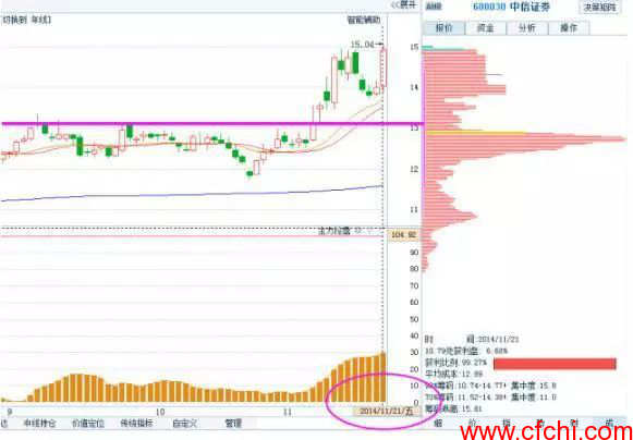 在2014年11月21号这个时间段,股价突破平台之后的回踩,我们可以看到10块钱到13块钱的这个位置获利盘还是非常集中,特别是平台这个筹码非常的集中。那么筹码这么集中上方套牢盘又少那么主力的意图就是继续拉升。