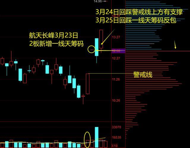 3月23日2板新增一线天筹码,次日回踩警戒线上方但一线天筹码无变化,此时第一等回踩模式结构已形成。