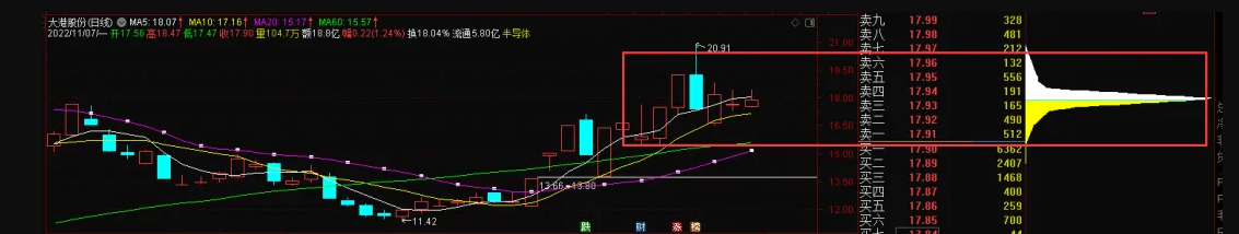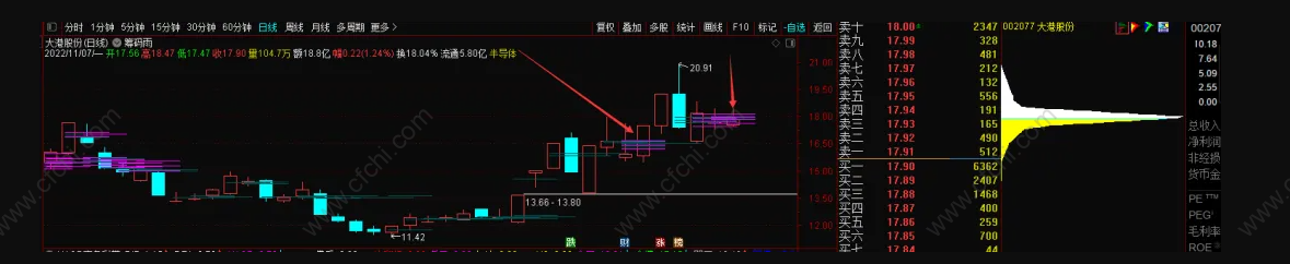 案例:大港股份,如图,非常明细的筹码密集,那么此刻说明很多人的筹码集中在这个位置,那么第二天的走势就很重要。我们就基本可以做好计划例如: