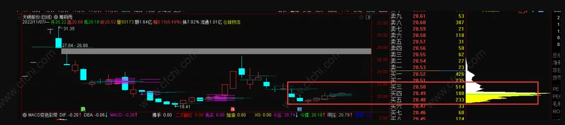 肉眼的去看筹码峰,非常麻烦,而且对于具体的价格位筹码也比较难控制。那么如果有一个指标能够显示出筹码的密集价格。对我们判断第二天的支撑、压力就有很好的帮助了。这个筹码指标就非常不错。如下图,筹码密集位置,一眼就能识别。