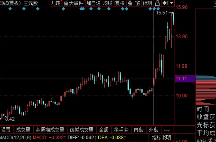 筹码分布图,股票术语,在K线图窗口的右侧,由紧密排列的水平柱状条构成。每根柱状条与 K 线图的价格坐标是相互对应的,同时,每根柱状条的长度表现出在这个价位上建仓的持股量占总流通盘的百分比。