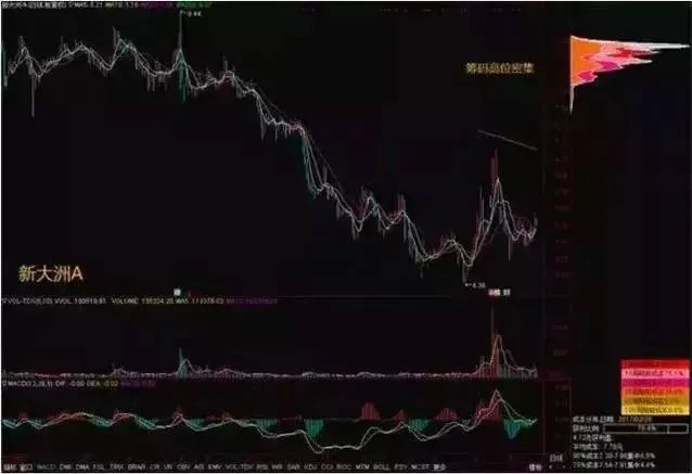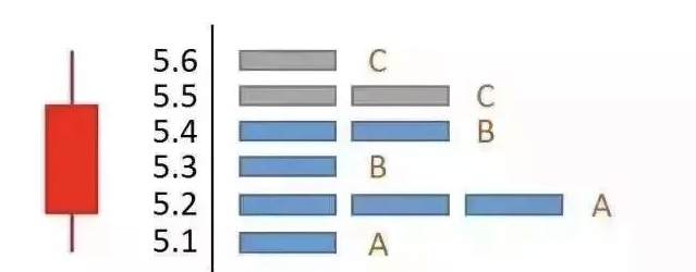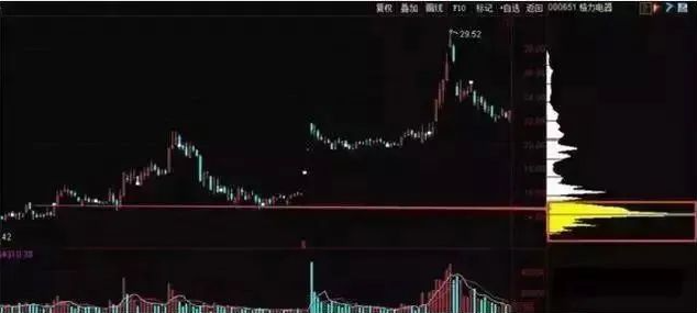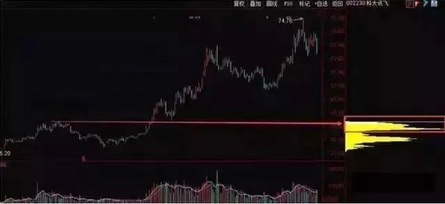 在K线图窗口的右侧,由紧密排列的水平柱状条构成。每根柱状条与 K 线图的价格坐标是相互对应的,同时,每根柱状条的长度表现出在这个价位上建仓的持股量占总流通盘的百分比。