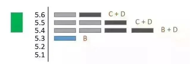 假设1月2日,A获利出场,将手中筹码分批卖给了D,那么当日的筹码分布图将呈现如下变化(深灰色代表新加入的D):