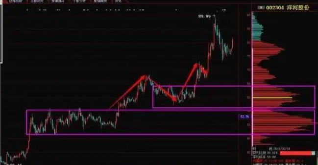 看图要点:股价经低位单峰密集后启动上攻行情,在拉升途中做震荡整理形成了一个或一个以上密集峰。新密集峰形成时原密集峰虽减小但仍存在。拉升途中的震荡整理属于洗盘性质。每一个密集峰都将成为该股回调洗盘的强支撑位。