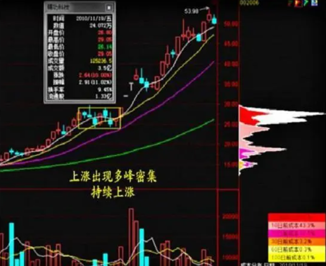 看图要点:股价经低位单峰密集后启动上攻行情,在拉升途中做震荡整理形成了一个或一个以上密集峰。新密集峰形成时原密集峰虽减小但仍存在。拉升途中的震荡整理属于洗盘性质。每一个密集峰都将成为该股回调洗盘的强支撑位。