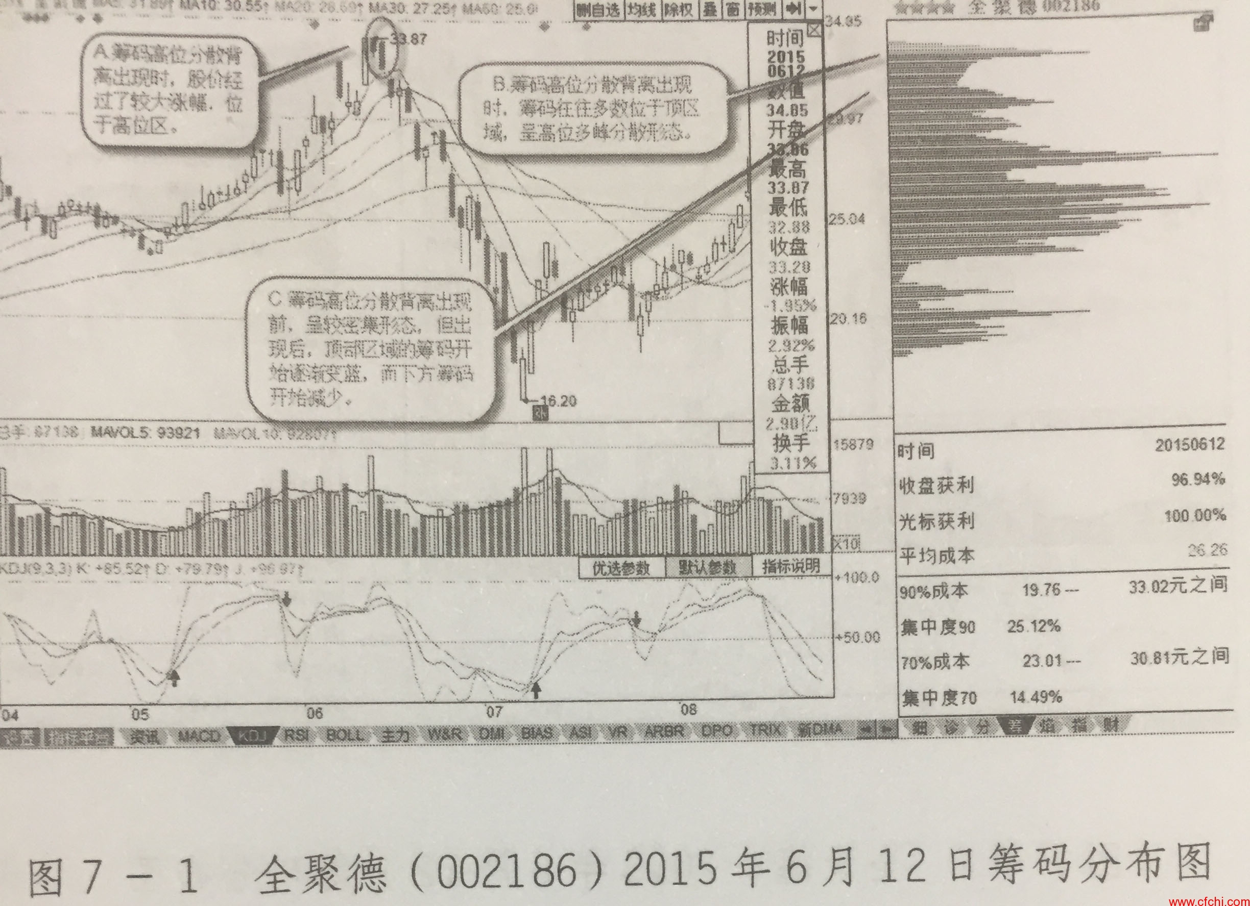 筹码高位分散背离,是指股价在上涨过程中,筹码往往是从低位单峰密集开始,即使是在上涨过程中逐渐演变为双峰或多峰,往往筹码是较为密集的,这是因跟风盘的不断涌入,以及主力持股不动造成的,但是到了股价高位区时,股价在上涨,筹码却出现了分散,于是就形成筹码高位分散背离。这种背离的出现,是主力及盘中获利筹码在上涨中悄然卖出股票所致,说明因主力资金的开始撤出,会出现顶部趋势反转,因此是一种卖出股票的形态。