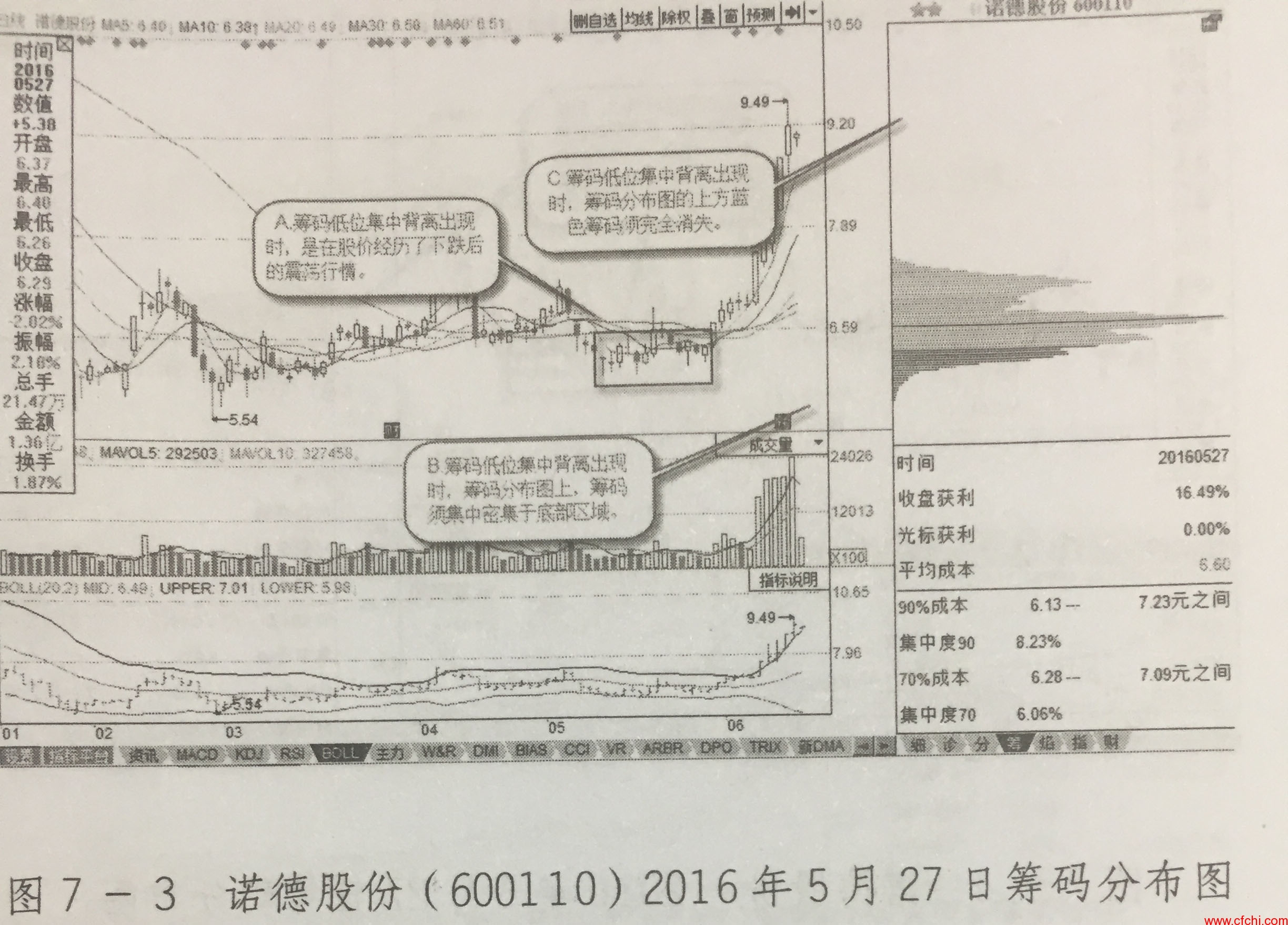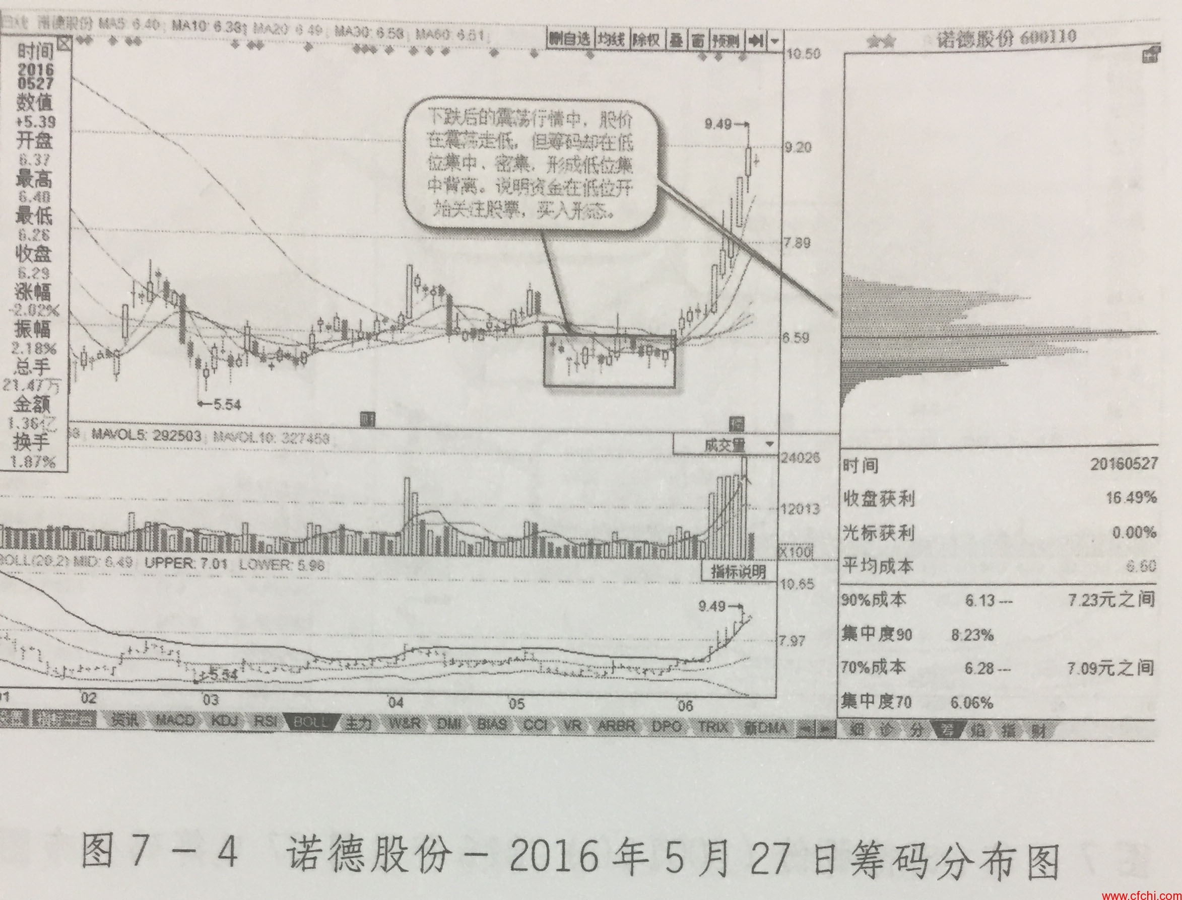 205年5月上旬,诺德股份在结束大践后的震落行情中,股价 持续假荡走低,但筹码却在低位形成了集中与密集,而此时第岛分时图上,上方蓝色的套牢筹码已经消失, 从而形成筹码低位集中背离。这说明股票在低位区得到了资金的关注, 而持续的资金在低位的介入,必然会导致其后股价的趋势反转向上。因此,投资者应在筹码低位集中背离出现时,及时在低位买入股票,并持股待涨,如图7- 4所示。