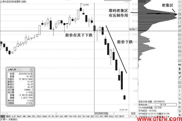 如图所示,股价受到了筹码密集区的压制后开始下跌。