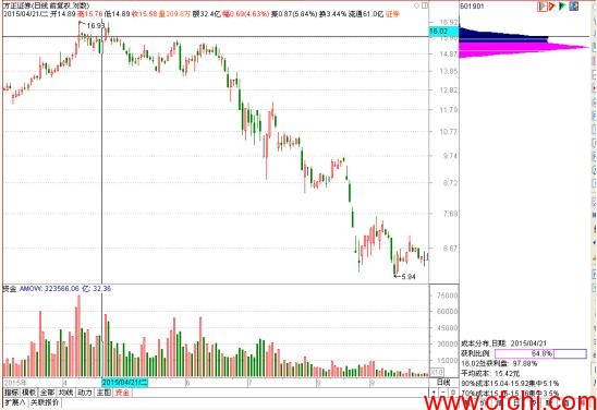 如图所示,这是方正证券(601901)2015年3月至2015年9月的日线图。图中可以清晰地看到,在十字光标定格的那一天,也就是2015年4月21日,该股右侧的筹码分布图在高位形成了一个可怕的密集峰。密集峰的下面空空荡荡的一无所有,这表明所有的筹码都已经在高位集聚,一旦筹码松动,后果将十分可怕。