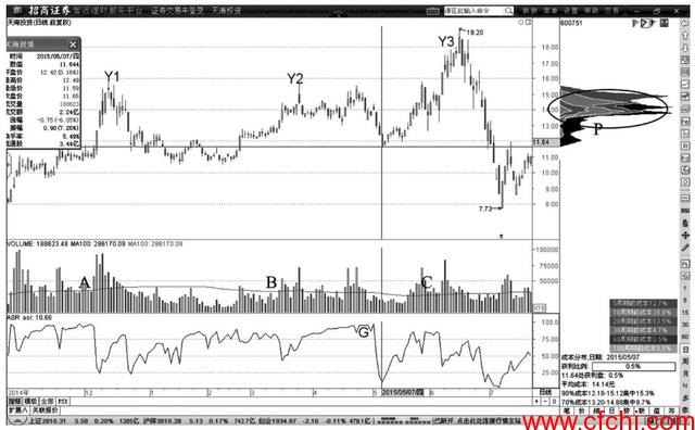 高位筹码峰规模最大:在图中P位置的筹码规模显著增大的时候,我们认为该股接近见顶。从浮筹指标看,图中G位置显示的ASR指标高达90以上,说明该位置筹码数量较大,并且多为浮筹。当股价第三次拉升股价到Y3位置顶部时候,这种价格短线脱离浮筹筹码峰的情况显然不能持续。股价追涨出现了更大的跌幅。