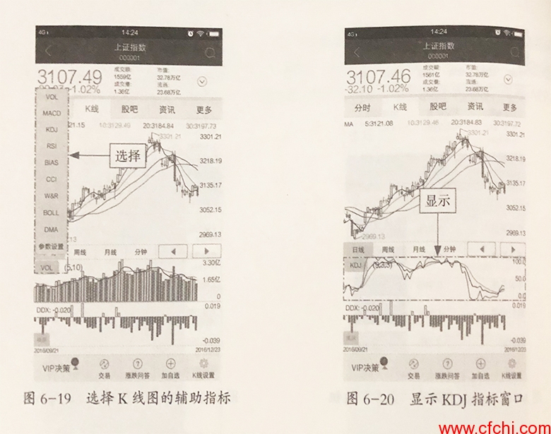 步骤5:点击左下方的“vOL"指标名称,在弹出的菜单中可以选择K线图的辅助指标,如图6-19所示。