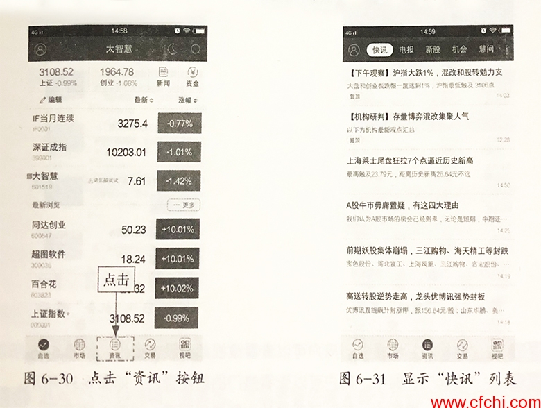步骤2:进入“资讯”界面,界面显示“快讯”列表,如图6-31所示。
